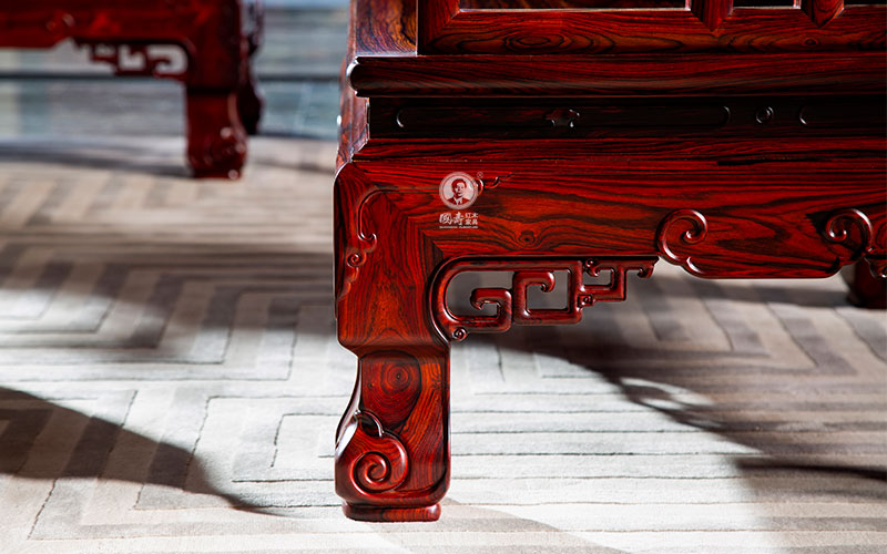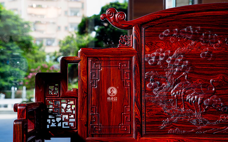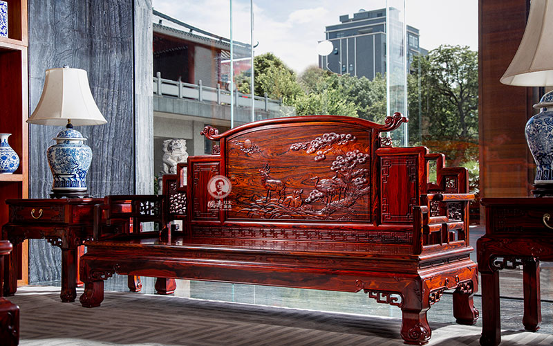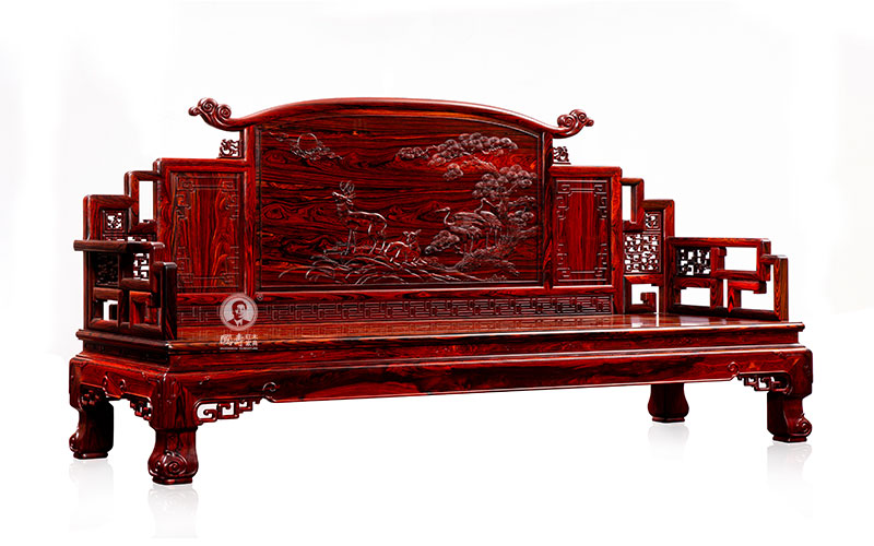 沙发造型庄重雅致,借鉴了清代宫廷家具常用的装饰题材——“拐子纹”,以攒接拐子纹为主要装饰,又似卷云,增加了视觉上的变化,厚重不显呆板,庄严不显沉闷。山字形围子,背板满雕,细节之处又颇富意趣,在崇山峻岭间,松柏茂盛,灵鹿生动活泼,仙鹤身姿矫健,寓意鹿鹤同春,祈求延年益寿,加官进禄。搭脑尾端祥云纹徐徐展开,灵动秀美。有束腰,外翻马蹄,别具匠心,也是在清代广式家具基础上的一个改良。