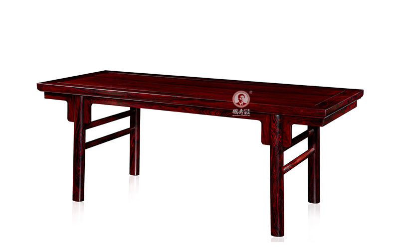 案面面攒框装板,两端出明榫,面芯纹理连贯自然。边抹冰盘沿,下接素刀牙板。四腿以夹头榫嵌入案面。两侧腿间装双横枨。此案线条简洁明快,素雅可人,造型靓丽,比例协调,完美体现了明式家具简约隽秀之美。