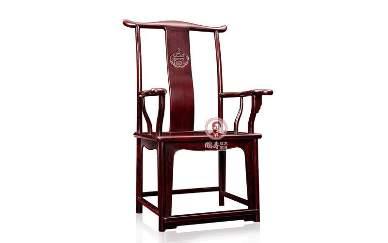 遵循官帽椅的基本造法,造型取意典雅,颇见明韵神采。椅背扶手借助曲线取得柔婉效果,让视觉上有飘然而动之感。靠背上端略作雕饰,以此来突出微凹黄檀木纹理的自然美感,给人静而不喧的感受,形成高雅、稳重大方的气场。椅盘下安素面牙子,沿边起阳线,腿足置步步高赶枨,衬得整椅优美挺拔,隽永耐看。