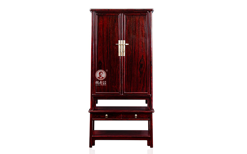 圆角柜帽檐、柜门、柜腿沿边皆起线,风格和谐统一。同柜的柜门之间纹理对称,无闩杆,不设柜膛。门上安长方形面叶,中部镂空作的吊牌。柜内以搁板分成三层空间,第二个屉板下安有两个抽屉的抽屉架。腿足方中带圆,柜腿间安光素刀牙条。带有两屉底座,增加了实用性。底座腿足侧脚加大,与圆角柜的A字形自然衔接。